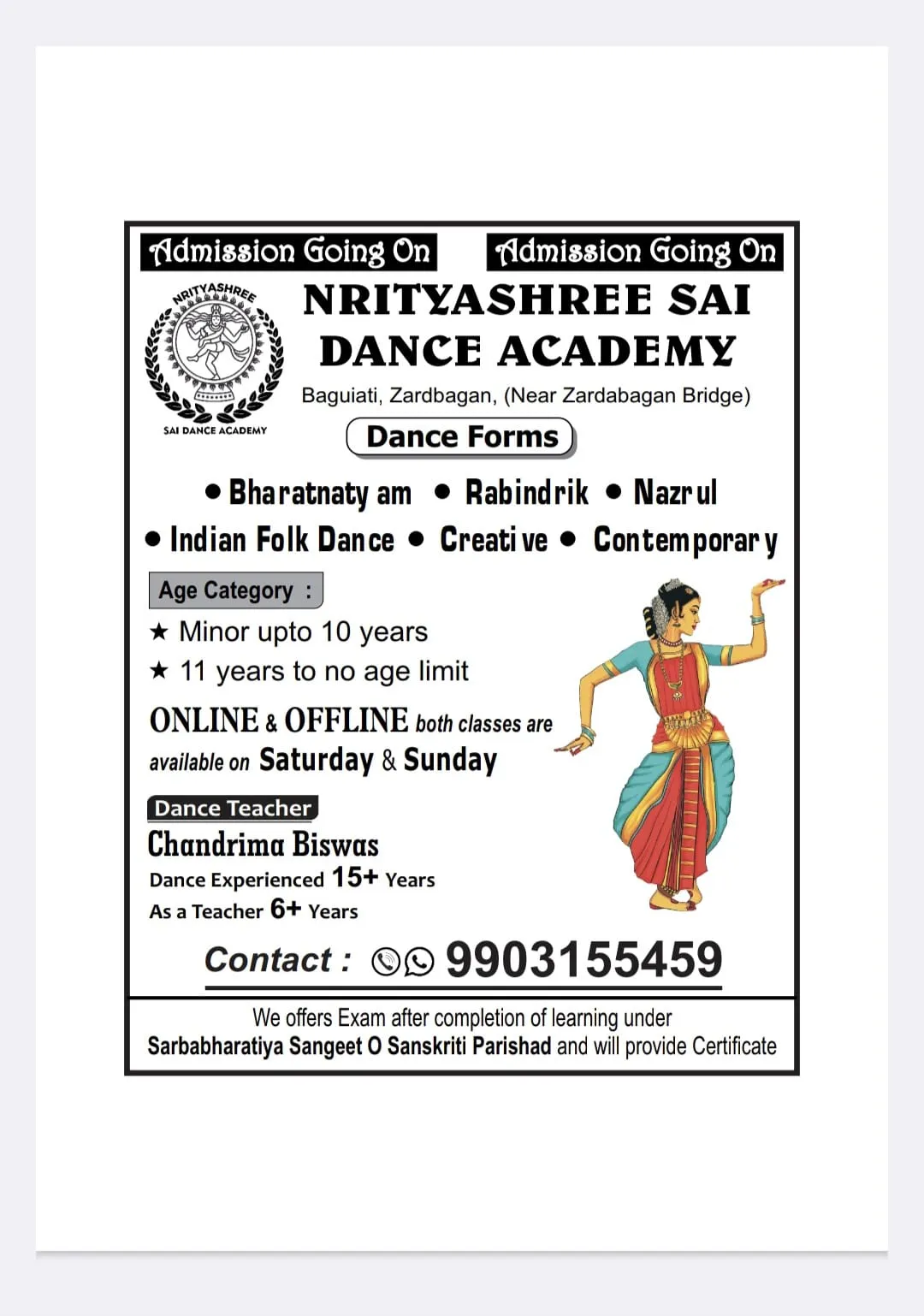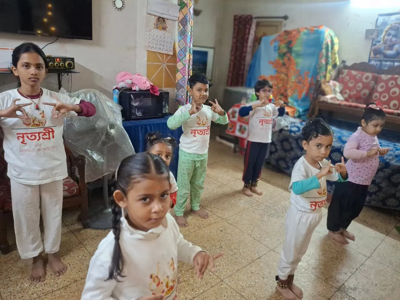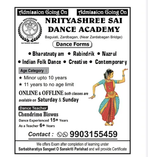 Nrityashree Sai Dance Academy is a dedicated cultural dance centre where dance is not only taught but truly experienced. Through proper technique, rhythm, expression, and discipline, students develop strong foundations in Bharatanatyam along with Rabindra Nritya, Nazrul Nritya, folk, and modern dance forms. Our mission is to nurture confidence, creativity, and cultural values in every student through the power of dance.